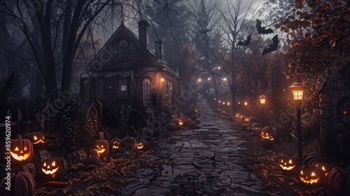 © Cloudyew, Fototapeta premium Haunted Halloween Pathway Layout Background
