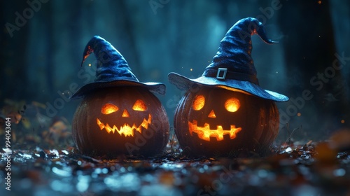Fototapeta premium Haunted Jack-O'-Lantern Pumpkins with Witch Hats in a Foggy Halloween Forest
