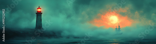 © Priyanut, Naklejka premium Haunted lighthouse, guiding a ghostly pirate ship, eerie glow, Watercolor style
