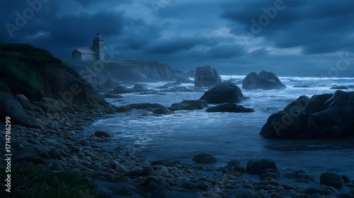 Obraz premium Haunting cliffside lighthouse over stormy sea with jagged rocks and dramatic...