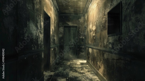 Obraz premium Haunting Corridor in Abandoned and Decaying Building with Grungy Eerie...
