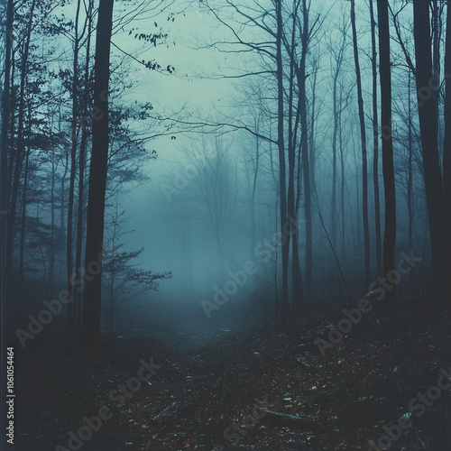 © Laurent, Fototapeta premium haunting forest pathway shrouded in fog with ghostly trees fading into the mist creating a spooky atmosphere