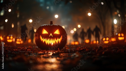 Fototapeta premium Haunting Halloween Night - Spooky Street with Glowing Jack-o'-lanterns and Shadowy Figures Under Eerie Atmosphere, Copy Space, Selective Focus. Ultra HD.