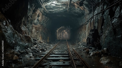 Naklejka premium Haunting mine tunnel, with dim light casting eerie shadows on the damp rock walls of an abandoned underground passage.