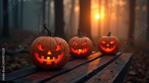 © Kristina, Obraz premium Haunting pumpkins with sinister glow beside empty bench