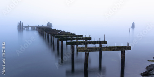 Naklejka premium Hauntingly beautiful abandoned pier stretching into misty tranquil waters...