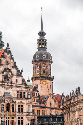 Naklejka premium Hausmannsturm tower and Dresden Cathedral Catholic Court Church in the old town or Altstadt of Dresden