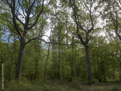 © Marc, Fototapeta premium Hauts chênes aux branches horizontales et tortueuses, aux troncs droits de la forêt de Montpensier dans l'Allier