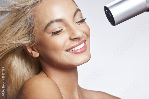 © Courtney H/peopleimages.com, Naklejka premium Have fun with your hair. Shot of an attractive young woman standing alone against a grey background in the studio and using a hairdryer.