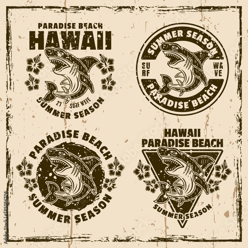 Obraz premium Hawaii paradise beach set of vector emblems, labels, badges or logos. Illustration on background with grunge textures