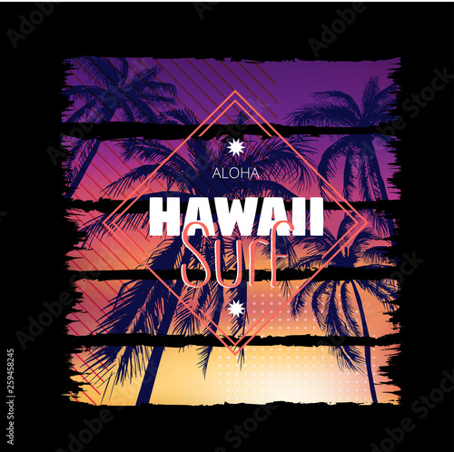 Fototapeta premium Hawaii surf. Colorful poster with palm trees. T-shirt print with inscription,...