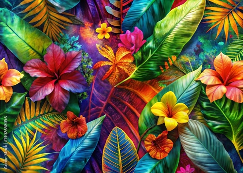 © Sirinporn, Naklejka premium Hawaiian Tribal Double Exposure Wallpaper: Tropical Leaves & Ancient Art