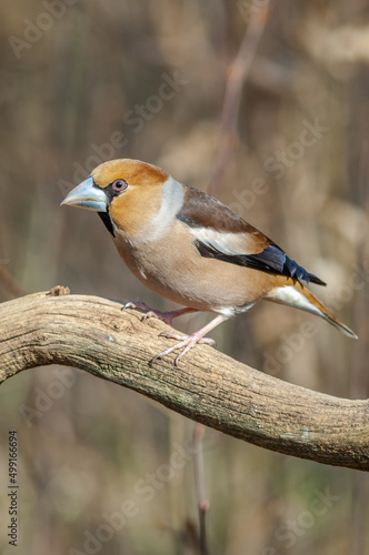 Naklejka premium Hawfinch (Coccothraustes coccothraustes) perched on a branch in the forest.