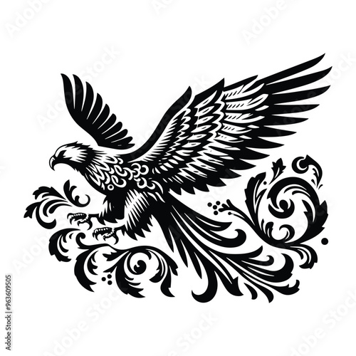 © Cici, Fototapeta premium Hawk bird with victorian flourish decoration, stencil logo, black and white animal illustration