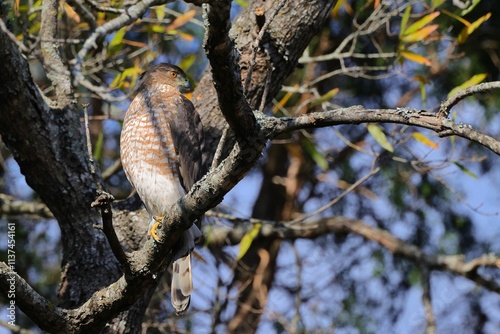 © Wirestock, Obraz premium Hawk perched on tree branch in forest.