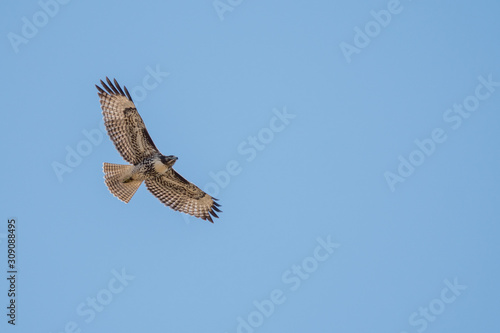 © MikeFusaro, Obraz premium hawk soaring flying in blue sky.