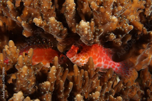 © nimetsacit, Naklejka premium hawkfish and hard corals