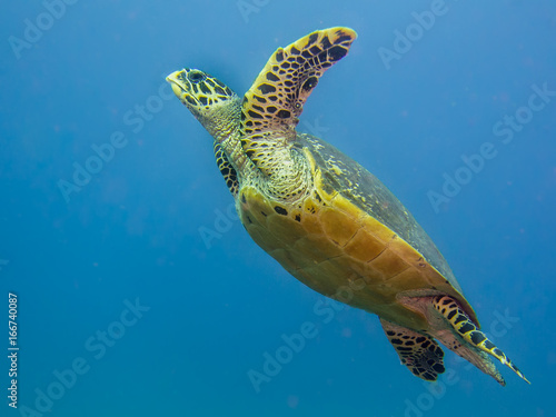 Obraz premium Hawks-bill sea turtle swimming in open water.