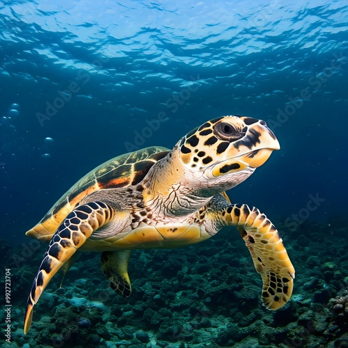 © Syed, Obraz premium Hawksbill Sea Turtle flowing into transparent water ocean