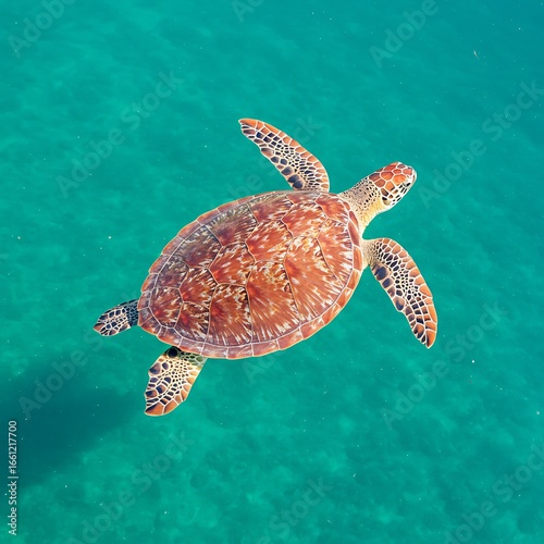 Fototapeta premium Hawksbill Sea Turtle Swimming Gracefully in Crystal Clear Turquoise Ocean Water