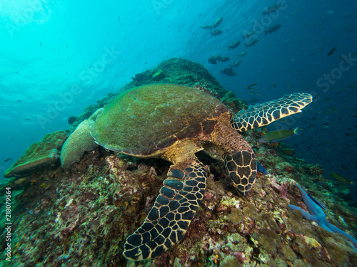 © Magnus, Obraz premium Hawksbill turtle eating on top of a coral reef