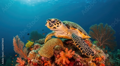 Fototapeta premium Hawksbill turtle resting on vibrant coral reef in clear, blue ocean water