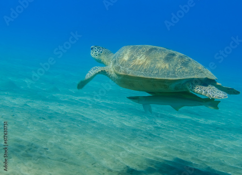 Obraz premium hawksbill turtle with two pilotfishes hovers over the seabed in clear blue water