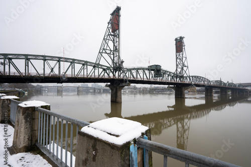 © Tada Images, Fototapeta premium Hawthorne Bridge viewed from the west bank of the Willamette River in Portland, Oregon, in winter. The truss bridge is the oldest vertical-lift bridge in operation in the United States.