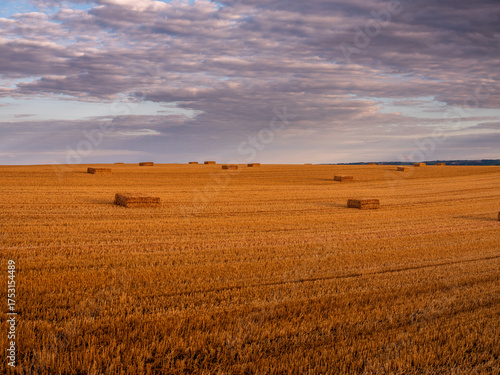 © oticki, Obraz premium Hay bales resting on golden harvested field under cloudy sky