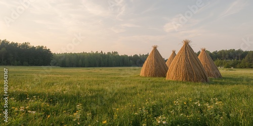 © The 2R Artificiality, Fototapeta premium Haystacks in a forest clearing surrounded by grass and mountain landscape during autumn, emphasizing rural agricultural practices