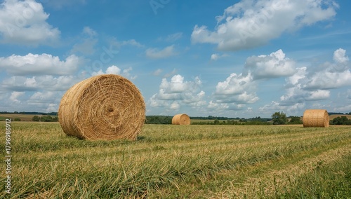 © -Quantum Pixels-, Fototapeta premium Haystacks scattered across a field, seasonal change