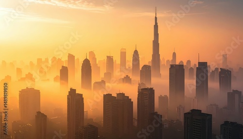 © Kitta Studio, Obraz premium Hazy Cityscape at Sunset with Thick Smoke and Distant Skyscrapers