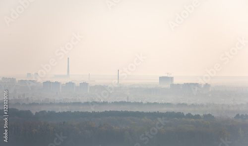 Fototapeta premium Hazy morning view on left riverside of Dnieper river in Kyiv, Ukraine.