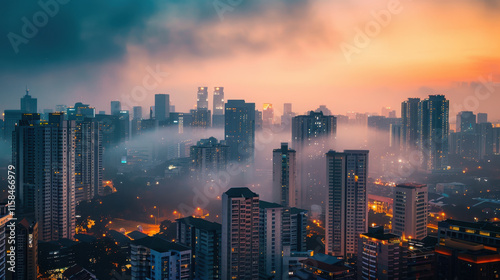 © KOSHKAROV SERGEI, Fototapeta premium Hazy Skyline Over a Bustling Urban Jungle
