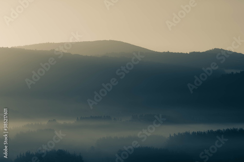 © Miguel, Fototapeta premium Hazy sunrise of the lands of Monforte lemos in Galicia Spain