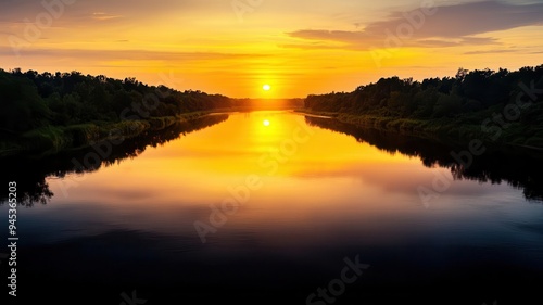 © Gyorgy, Obraz premium Hazy sunset over a calm river, humid weather, golden hour light