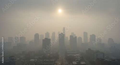© Farhan, Fototapeta premium Hazy Urban Landscape with Sun Above Buildings