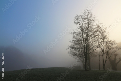 Fototapeta premium hazy winter sunrise in waterside park