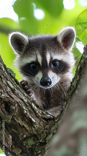 © ahmed, Fototapeta premium HD Phone Wallpaper Adorable Baby Raccoon Hiding in Tree Wildlife Nature Close Up