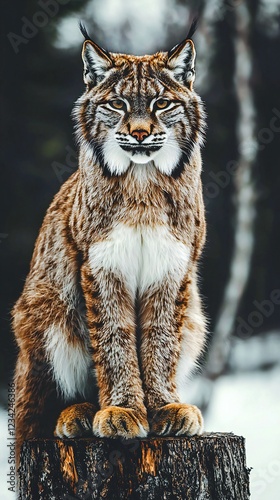Fototapeta premium HD Phone Wallpaper Majestic Eurasian Lynx Sitting on Tree Stump in Snowy...