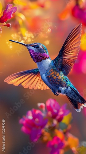 © ahmed, Obraz premium HD Phone Wallpaper Vibrant Hummingbird in Flight Amongst Colorful Flowers Nature Photography