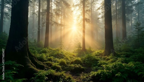 Naklejka premium HD photography of a dense pine forest covered in early morning mist, golden sunlight streaming through tall trees, highlighting lush green moss and ferns on the forest floor. Dewdrops on leaves, soft