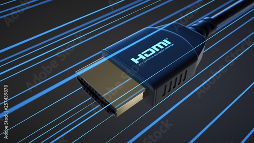 © Negro Elkha, Obraz premium HDMI connector with information rays on dark background. #2