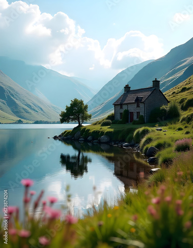 © Jashim, Naklejka premium HDR Landscape of Wildflowers, River, and Mountain Heights