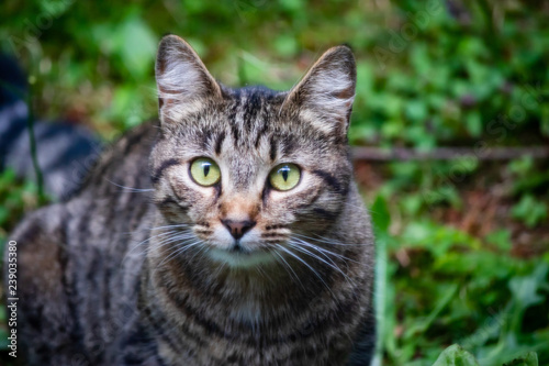 © Taya, Fototapeta premium head and body of a green eyed tabbly cat