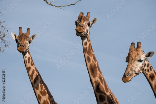 © Lois GoBe, Naklejka premium Head and neck of three giraffes, photographed against clear blue sky at Port Lympne Safari Park near Ashford, Kent, UK