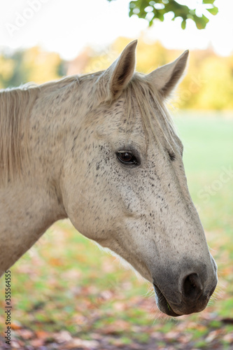 Fototapeta premium Head, face and neck of beautiful dapple grey horse under soft even light