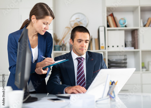 Fototapeta premium Head gives task to assistant at office at table