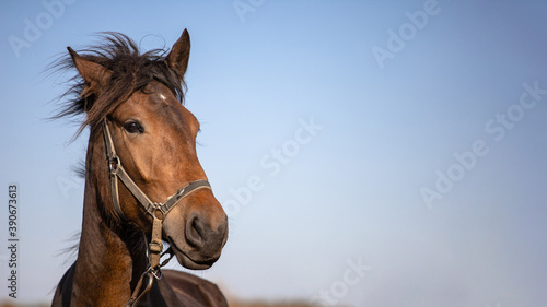 © Sergey, Fototapeta premium head of a beautiful brown horse against the sky, copy space