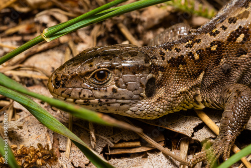 Fototapeta premium Head of a famale Lizard, macro photo of a head of a female lizard, Lacerta Agilis